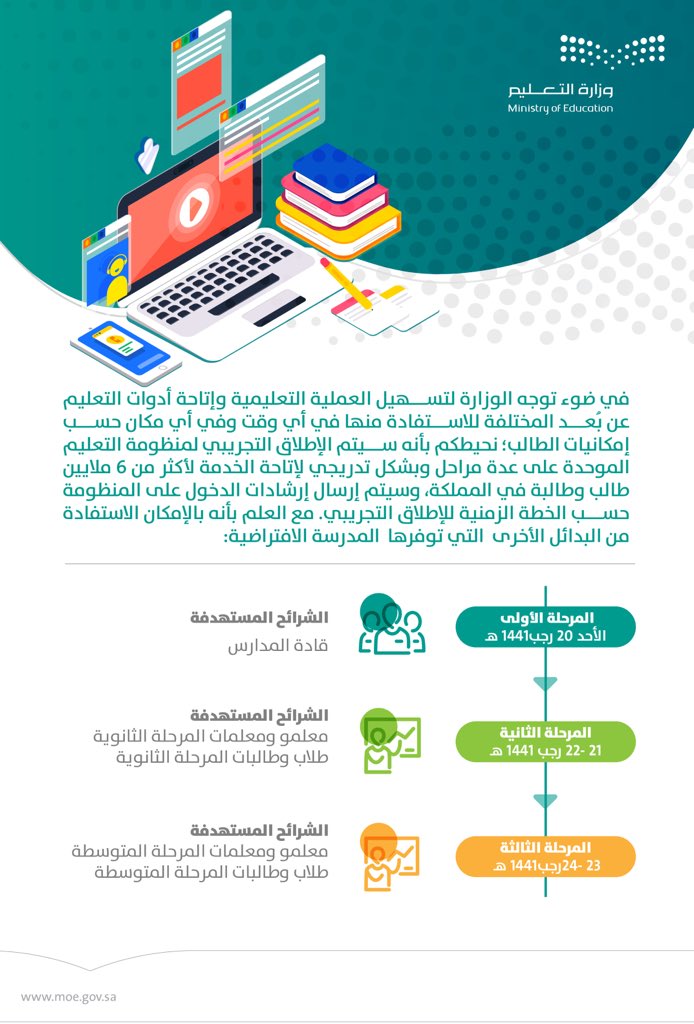 وزارة التعليم عام Sur Twitter تتيح المدرسة الافتراضية للطلاب والطالبات خيار التعلم عن ب عد من خلال الإطلاق التجريبي لمنظومة التعليم الموحدة Https T Co Gu5wijs3o6 على عدة مراحل تدريجية لإتاحة الخدمة لأكثر من 6