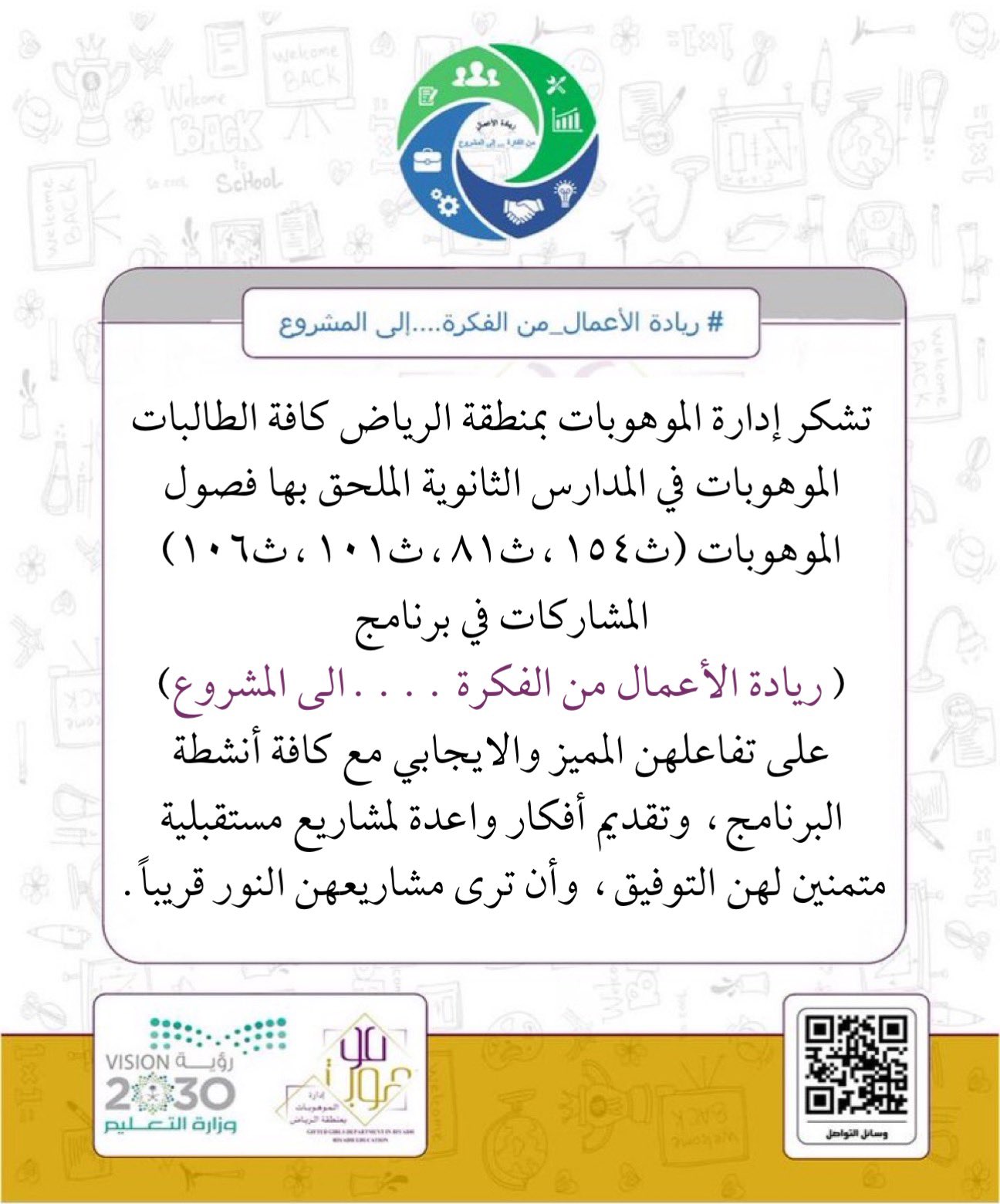 حساب ملغي On Twitter تشكر إدارة الموهوبات كافة الطالبات الموهوبات في المدارس الثانوية الملحق بها فصول موهوبات ث١٥٤ ث٨١ ث١٠١ ث١٠٦ المشاركات في برنامج ريادة الأعمال من الفكرة الى المشروع على تفاعلهن
