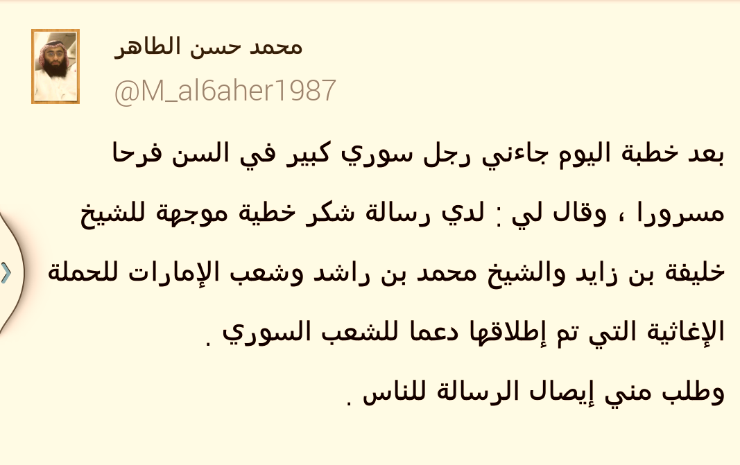 محمد حسن الطاهر Auf Twitter رسالة شكر من رجل سوري موجهة للشيخ خليفة بن زايد Uaerc1 Http T Co Sqcilydcrd