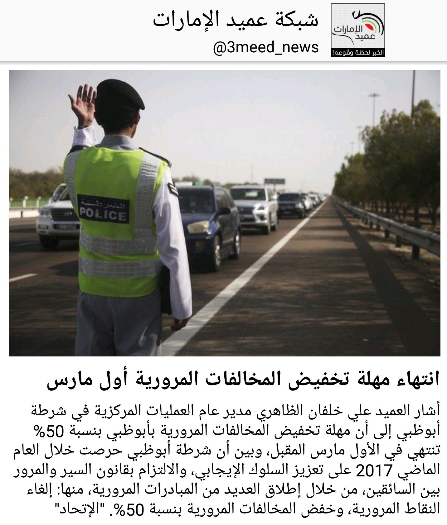 شبكة عميد الإمارات On Twitter أشار العميد علي خلفان الظاهري مدير عام العمليات المركزية في شرطة أبوظبي إلى أن مهلة تخفيض المخالفات المرورية بأبوظبي بنسبة 50 تنتهي في الأول مارس المقبل وبين