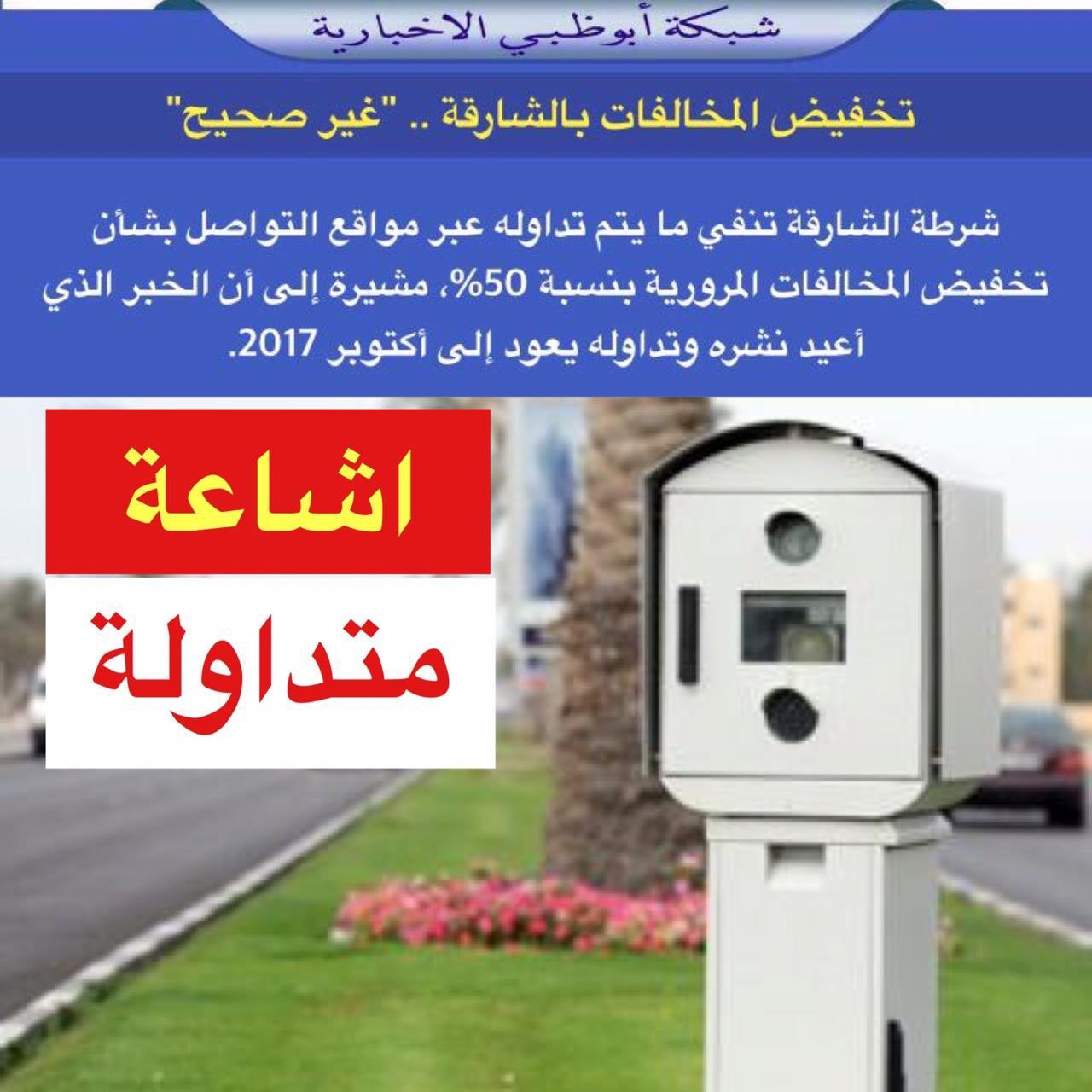شبكة أبوظبي On Twitter تخفيض المخالفات بالشارقة غير صحيح شرطة الشارقة تنفي ما يتم تداوله عبر مواقع التواصل بشأن تخفيض المخالفات المرورية بنسبة 50 مشيرة إلى أن الخبر الذي أعيد