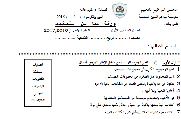 مجموعة اوراق عمل لدرس تصنيف الكائنات الحية لمادة العلوم الصف الرابع الفصل الاول منتديات صقر الجنوب