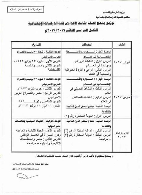 توزيع منهج الدراسات الاجتماعيه للصف الثالث الاعدادي 2017 ترم ثان