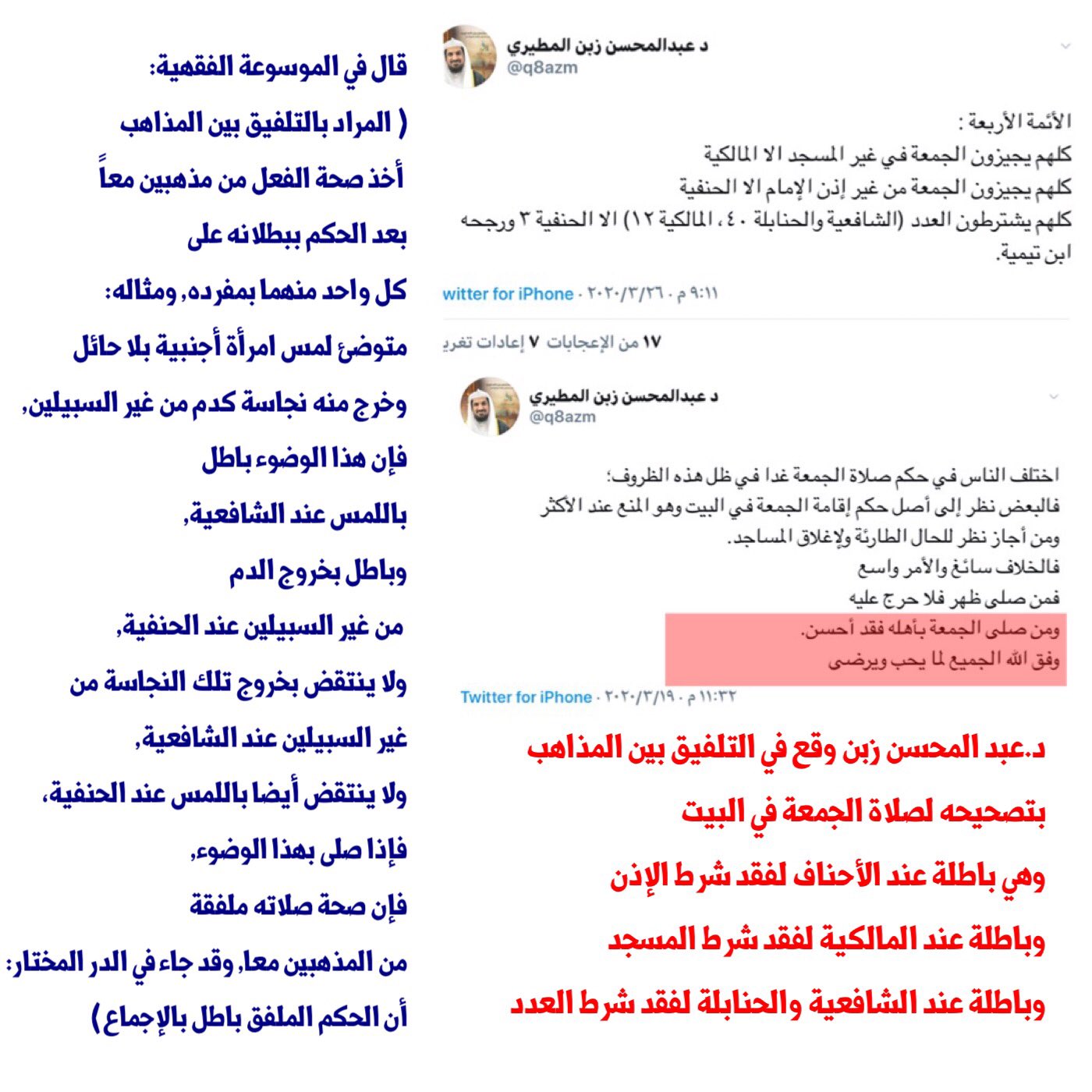 فواز البرازي على تويتر تصحيحك لفعل صلاة الجمعة في البيوت تلفيق واضح أخذت من المالكية عدم اشتراط المسجد ومن الأحناف عدم اشتراط إذن الإمام والإكتفاء ب٣ أشخاص وهذا هو التلفيق الباطل